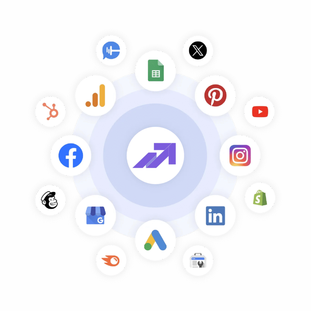 You can connect popular platforms like Facebook Ads, Google Ads, LinkedIn Ads, TikTok Ads, Instagram Insights, Google Analytics, Shopify, Stripe, and more. Custom data sources can also be added via REST API.