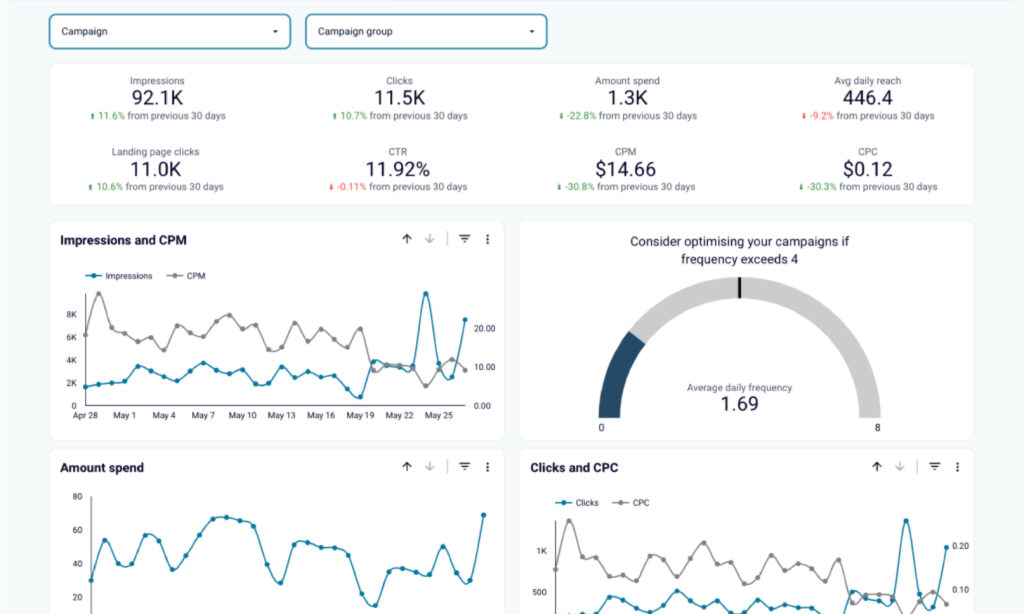 Bring all campaign metrics into one view. Spot trends, track performance by platform, and prove ROI with cross-channel reporting.